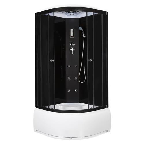 Deze douchecabine heeft een kwartronde vorm en is optimaal geschikt voor vloermontage. Daarnaast wordt de cabiner geleverd met een douchebak en een afvoer, waardoor hij direct klaar voor gebruik is. Met afmetingen van 900 x 900 x 2200 millimeter past deze cabine perfect in elke badkamer, en is hij grotendeels zwart van kleur voor een moderne uitstraling.