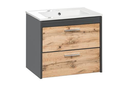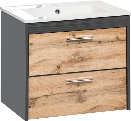 Het Sanifun badkamermeubel biedt twee ruime schuiven, perfect voor het opbergen van al uw badkamerbenodigdheden. De kwaliteit van de materialen is hoogstaand; de onderkast is vervaardigd uit stevig spaanplaat en heeft een elegante anthraciet kleur, die prachtig contrasteert met de witte keramische wastafel. Dit meubel is niet alleen een aanvulling op uw interieur, maar ook een praktische keuze voor dagelijks gebruik.