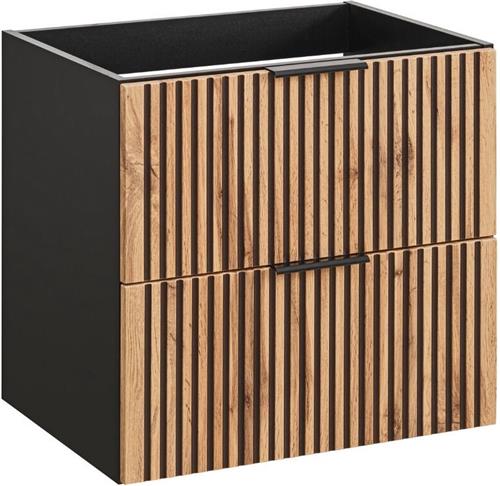 Transformeer uw badkamer met het stijlvolle Sanifun badkamermeubel Wotan 600. Dit elegante meubelstuk, afgewerkt in zwart met prachtige bruin eiken geribbeld, biedt een moderne touch aan elke badkamer. Met de afmetingen van L 600 x D 460 x H 570 mm is het meubel perfect voor zowel kleine als grotere ruimtes.
